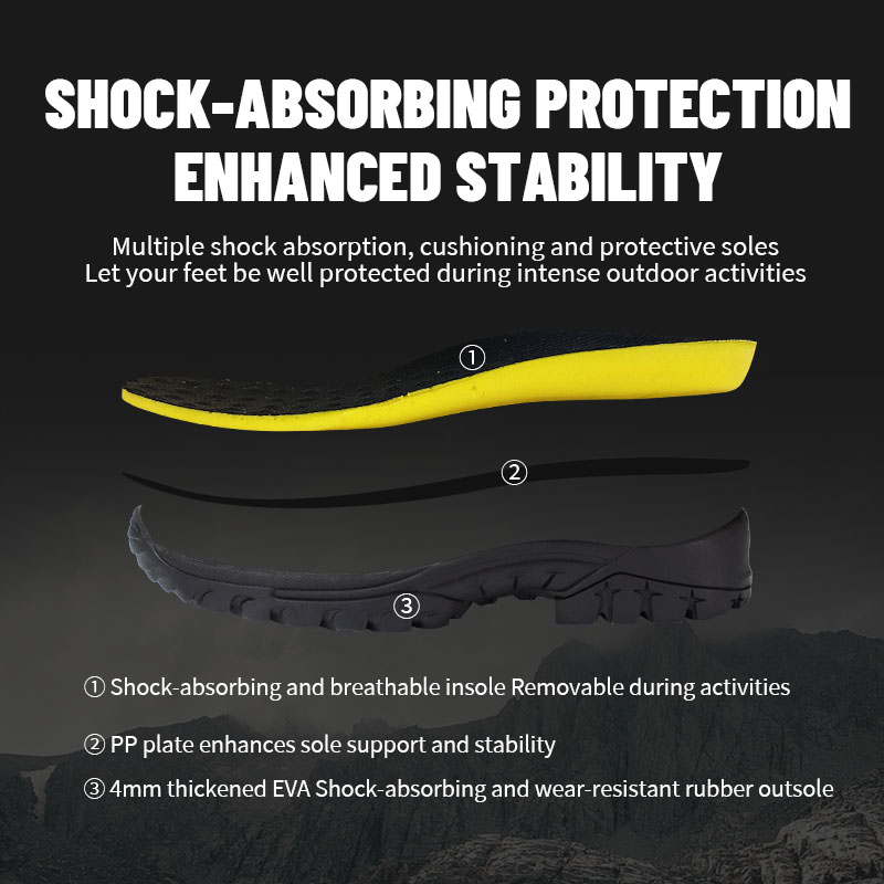 ①कुशन युक्त, सांस लेने योग्य इनसोल - जब आपको इसे साफ करने या बदलने की आवश्यकता हो तो हटाने योग्य। ②अतिरिक्त पैरों के समर्थन के लिए पीपी प्लेट के साथ प्रबलित - ताकि हर कदम ठोस और नियंत्रित महसूस हो। ③4 मिमी मोटा ईवीए शॉक-अवशोषित और पहनने के लिए प्रतिरोधी रबर आउटसोल।