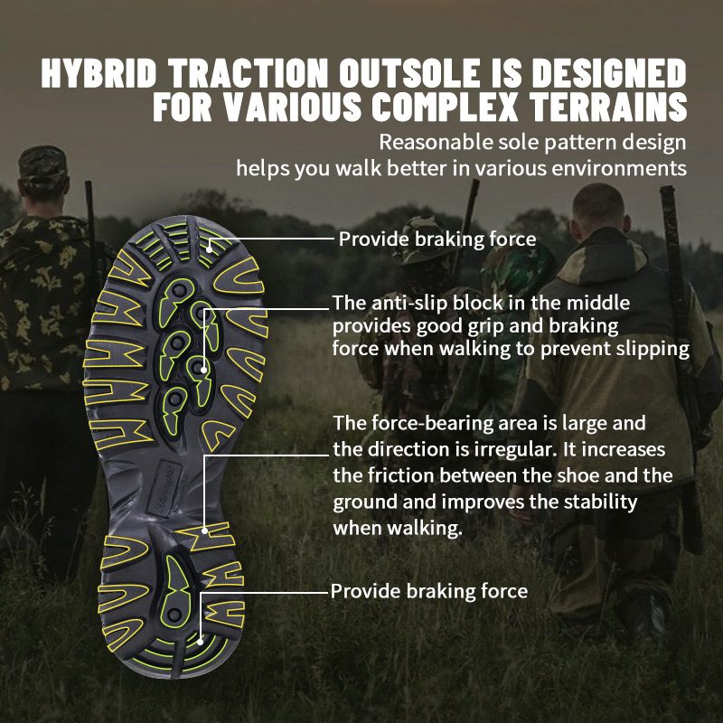 ①पोलियौ उच्च-खिंचाव नमी सोखने वाला इनसोल आंतरिक भाग को सूखा रखता है। ②EVA मिडसोल, छलावरण कपड़े में लपेटा हुआ, कुशनिंग और शॉक अवशोषण। ③टिकाऊ रबर आउटसोल, गैर-पर्ची और पहनने के लिए प्रतिरोधी।
