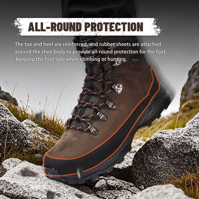 पैर की अंगुली और एड़ी को मजबूत किया जाता है, और पैर को सर्वांगीण सुरक्षा प्रदान करने के लिए जूते के शरीर के चारों ओर रबर की चादरें लगाई जाती हैं, जिससे चढ़ाई या शिकार करते समय पैर सुरक्षित रहता है।